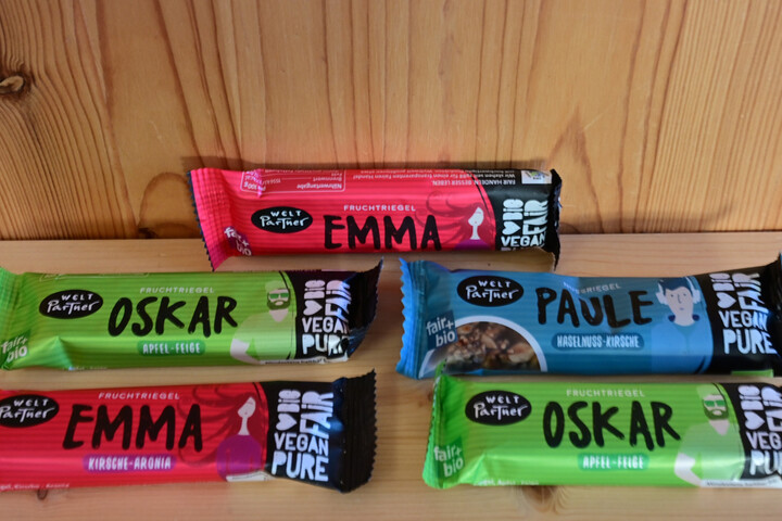Kleiner Snack für die Handtasche oder den Rucksack – das sind Emma, Oskar, Paule und Co – die Riegel von Weltpartner. Die Zutaten – fair gehandelt – stammen von Partnern aus der Türkei, aus Tunesien und Burkina Faso. Angenehm fruchtig...