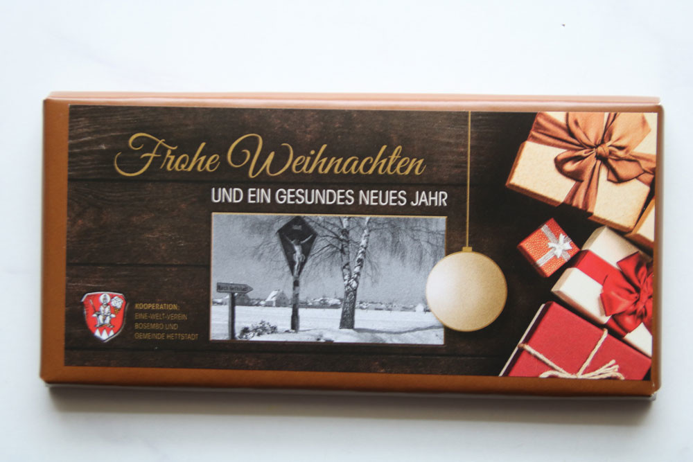 In Zusammenarbeit mit der Gemeinde Hettstadt entstand diese „Weihnachtsschokolade“. Ein winterliches Bild vom Ortseingang Hettstadts und ein Weihnachtsgruß zieren diese Schokolade. Es ist eine Bio Vollmilchschokolade. Der Rohrohrzucker, Kakao und Vanille wurden von Fairtrade-Produzenten angebaut, nach Fairtradestandards zertifiziert und gehandelt....