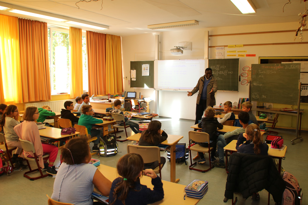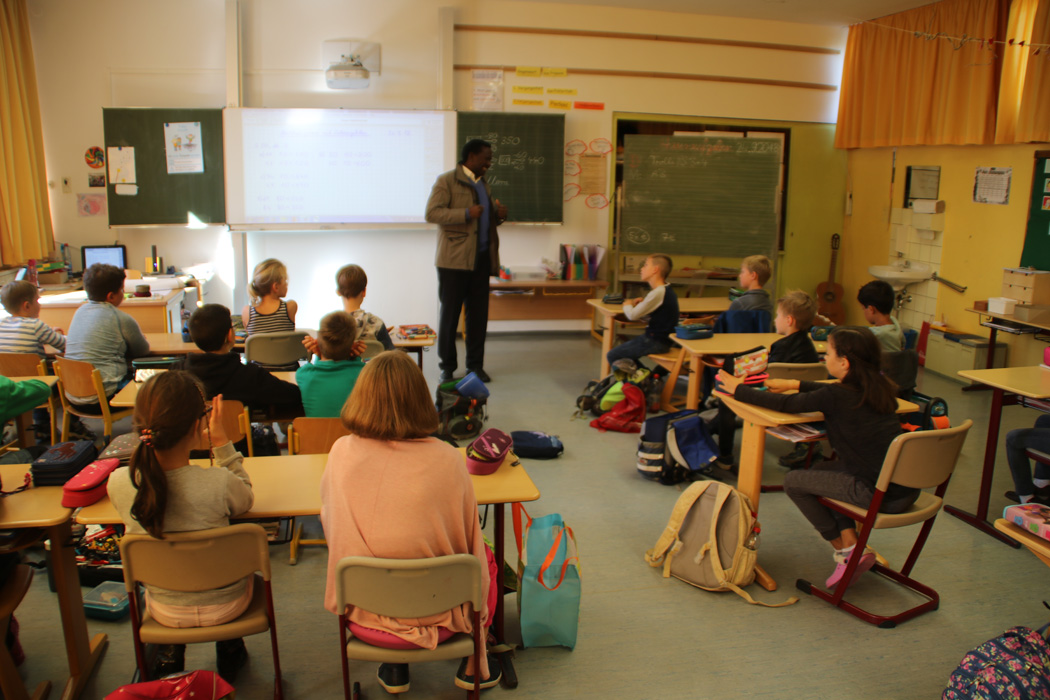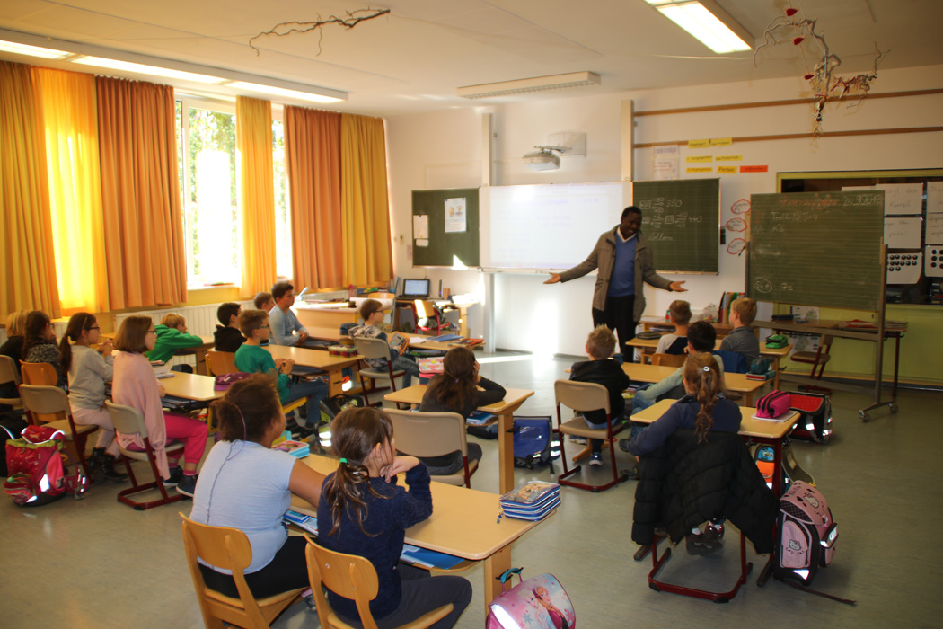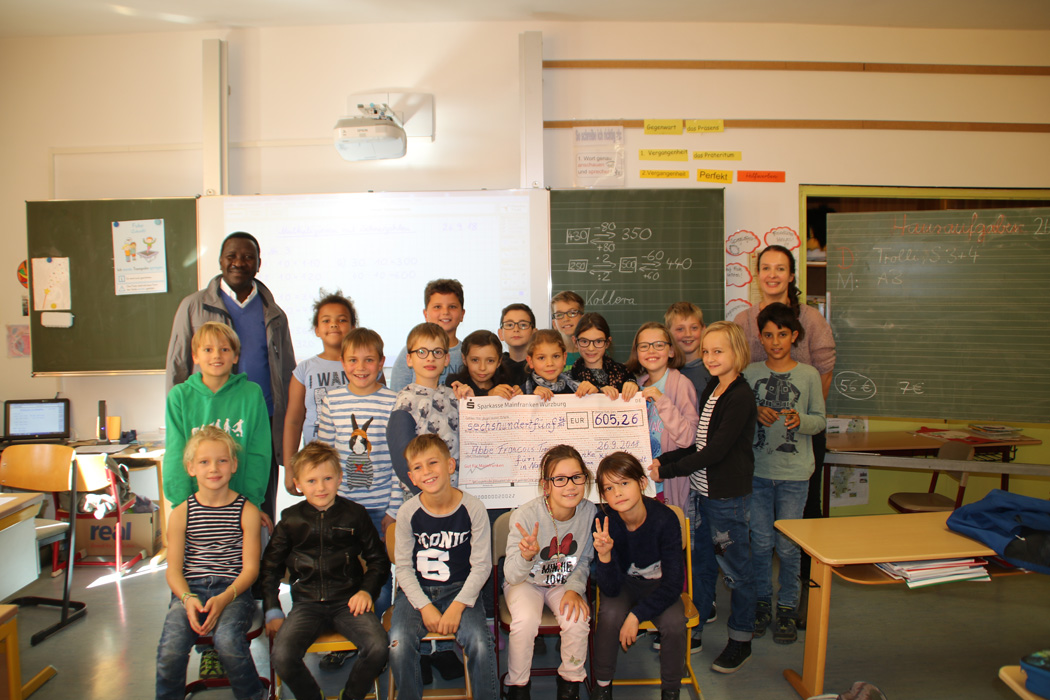 Für die Schulbänke übergaben die Schülerinnen und Schüler der vierten Klasse der Grundschule Hettstadt einen Scheck an Abbé Francois Tiando.