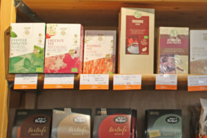 Sorten, die wir im Sortiment haben: Schokolade: Grand Noir Bio Zartbitter, 70% Kakao (100g) Grand Noir Bio Feinherb, 55% Kakao (100g) Grand Noir Bio Orange, 70% Kakao (100g) Premium Bio Noir Mint, gefüllte Bitterschokolade mit Mintcréme (100g) und andere Süßigkeiten: Bio Bären und Bio Cola Bären, Paraguay (75g) “Jelly Fruit“ Bio-Geleefrüchte, Paraguay (100g) Mango-Monkeys, Fruchtgummi, Paraguay-Philippinen (100g) Bio-Dschungel-Mix, Fruchtgummi, Philippinen (100g) Kirsch-Ingwer Bonbons (100g)…
